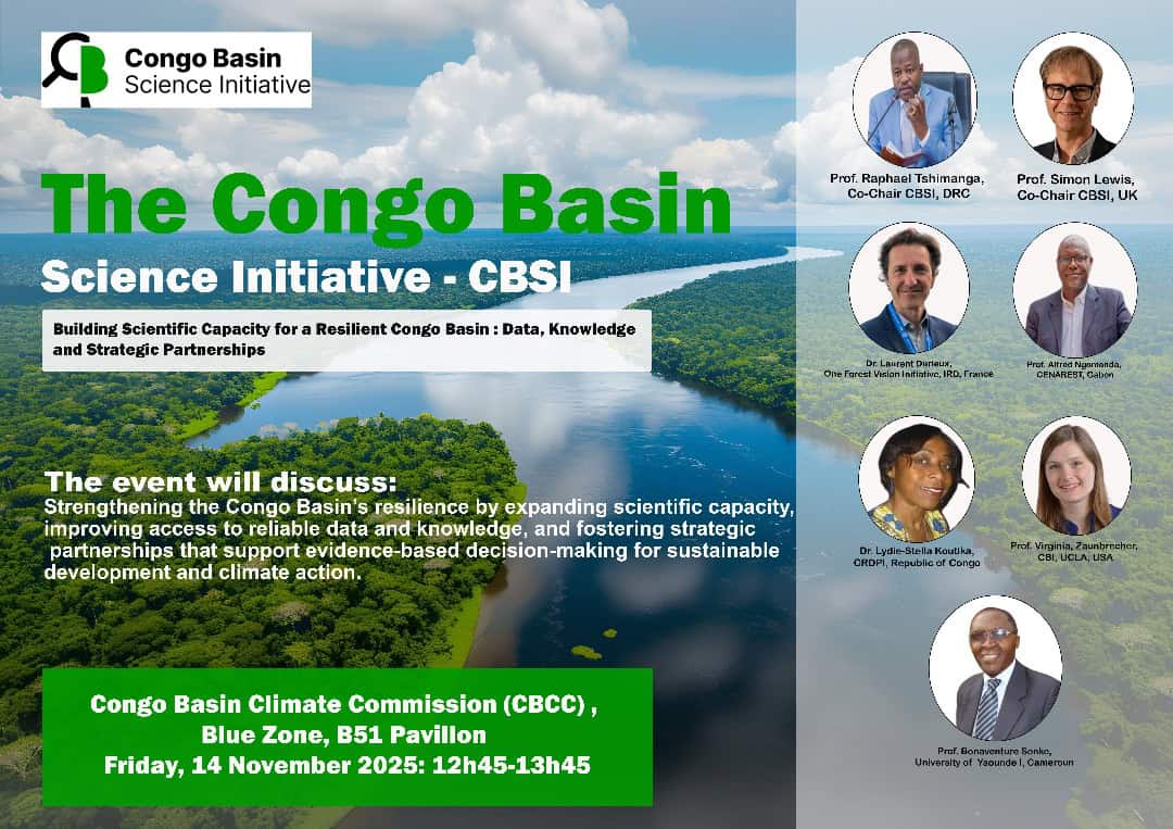 | Friday 14 November 12:45 – 13:45 (time in Brazil), 15:45 (UK time) | The Congo Basin Science Initiative – CBSI Building Scientific Capacity for a Resilient Congo Basin: Data, Knowledge and Strategic Partnerships | In person: Congo Basin Climate Commission (CBCC) , Blue Zone, B51 Pavilion YouTube Livestream: https://youtube.com/channel/UCdZDuD-wnT2KBZmGCUCwnqg Facebook Livestream: https://www.facebook.com/FondsBleuBassinDuCongo | Prof. Raphael Tshimanga, Co-Chair CBSI, DRC Prof. Simon Lewis, Co-Chair CBSI, UK Prof. Alfred Ngomanda, CENAREST, Gabon Prof. Bonaventure Sonke, Université Yaoundé I, Cameroun Dr. Laurent Durieux, One Forest Vision Initiative, IRD, France Dr. Lydie-Stella Koutika, CRDPI, Republic of Congo Prof. Virginia, Zaunbrecher, CBI, UCLA, USA ( Moderator) |