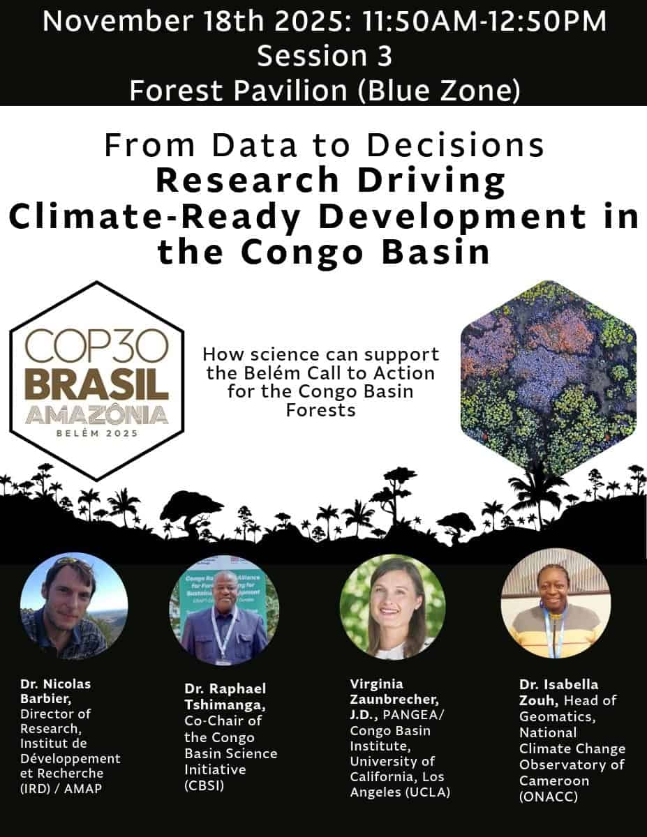 | Tuesday 18 November 11:50 am – 12:50 pm (time in Brazil), 14:50 (UK time) | From Data to Decisions Research Driving Climate-Ready Development in the Congo Basin. How science can support the Belém Call to Action for the Congo Basin Forests | In person: Forest Pavilion (Blue Zone) | Dr. Nicolas Barbier, Director of Research, Institut de Développement et Recherche (IRD) / AMAP Dr. Raphael Tshimanga, Co-Chair of the Congo Basin Science Initiative (CBSI) Virginia Zaunbrecher J.D., PANGEA / Congo Basin Institute, University of California, Los Angeles (UCLA) Dr. Isabella Zouh, Head of Geomatics, National Climate Change Observatory of Cameroon (ONACC) |